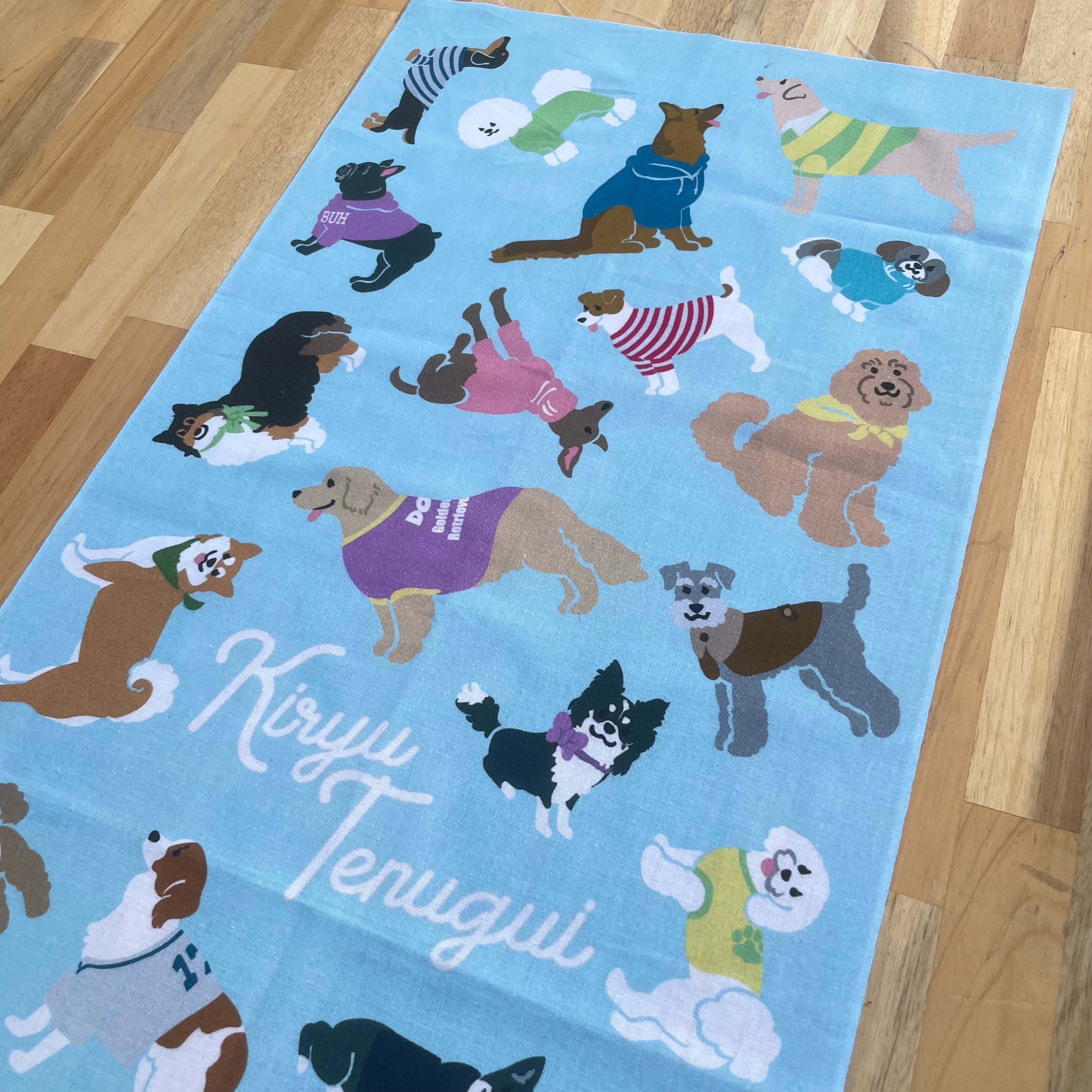 さまざまな犬種のわんこたちが、お洋服を着ておめかしして爽やかでポップ、キュートなデザインのてぬぐいです!
